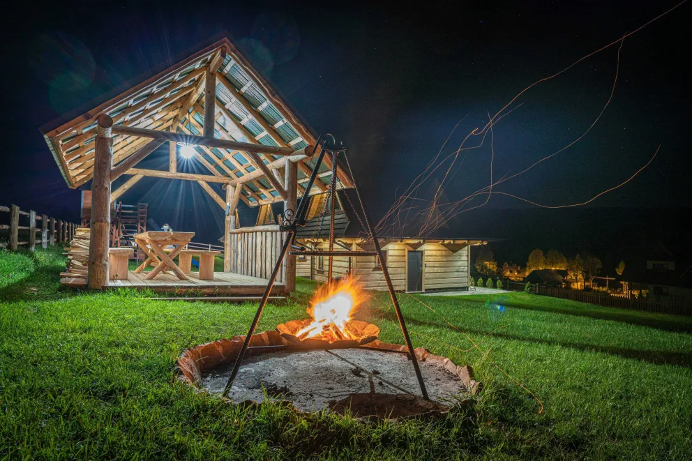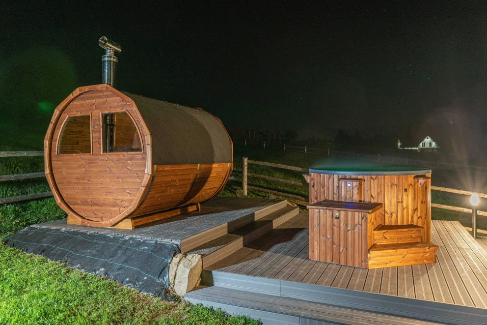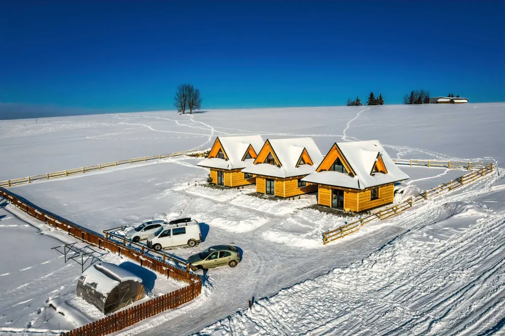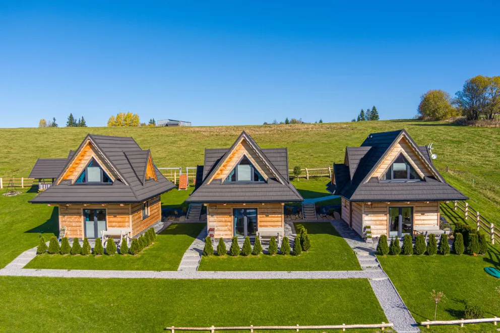 Do Państwa dyspozycji są 3 domki, każdy o powierzchni 57m2. W naszych domkach znajduje się w pełni wyposażona kuchnia (lodówka, zmywarka, płyta indukcyjna, kuchenka mikrofalowa, czajnik, zestaw naczyń oraz sztućców), łazienka z prysznicem, WC oraz pralką, salon TV oraz rozkładana kanapa (2 os.).